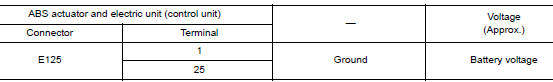 Check voltage between ABS actuator and electric unit (control unit) connector E125 terminals 1, 25 and ground.