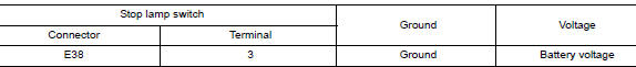 Check voltage between stop lamp switch connector E38 terminal 3 and ground.