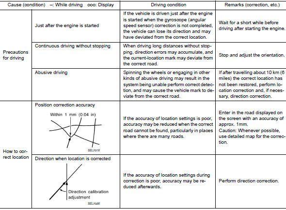Vehicle's travel amount is calculated by reading its travel distance and turning angle. Therefore, if the vehicle is driven in the following manner, an error will occur in the vehicle's current location display. If correct location has not been restored after driving the vehicle for a while, perform location correction.