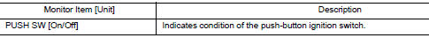 Engine switch (push switch) | IPDM E/R (CAN) | Inputs the push-button ignition switch (push switch) signal and transmits the ignition switch status judged with BCM via CAN communication. |